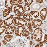 Immunohistochemical staining of human kidney shows strong cytoplasmic positivity in renal tubules.