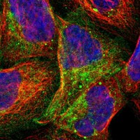 Enhanced validation is performed using either siRNA knockdown, tagged GFP cell lines or independent antibodies. For the siRNA validation the decrease in antibody-based staining intensity upon target protein downregulation is evaluated. For the GFP validation the signal overlap between the antibody staining and the GFP-tagged protein is evaluated. For the independent antibodies validation the evaluation is based on comparison of the staining of two (or more) independent antibodies directed towards independent epitopes on the protein.