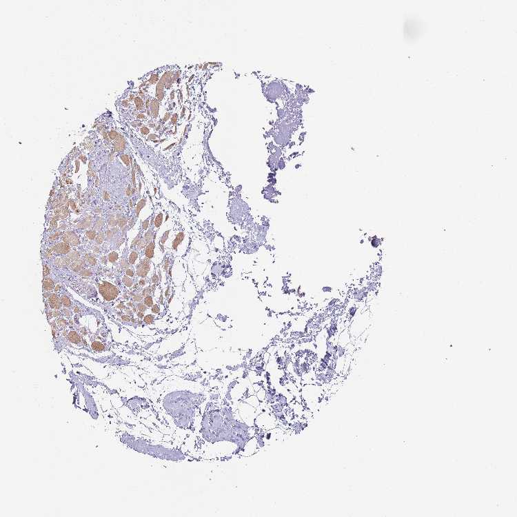 Antibody staining in the annotated cell types in the current human tissue is reported as not detected, low, medium, or high. This score is based on the staining intensity and fraction of stained cells.