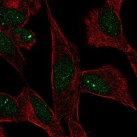 The "human cells" section gives an overview about the subcellular location of the protein of interest obtained by indirect immunofluorescence microscopy, an antibody-based protein-visualization technique. The immunofluorescent analysis is carried out in three different cell lines, one of them always being U-2 OS. A selection of immunofluorescent images is displayed below. Three different organelle probes are displayed as different channels in the multicolor images - nucleus stained in blue, microtubules in red and ER in yellow. The antibody staining targeting the protein of interest is shown in green. By using the toggle channel buttons, the different channels can be turned on and off. For the selection of the images to compare, use the checkboxes next to the images at the bottom. Three images can be compared at a time. All images are clickable for an enlarged view. The selected image will appear in large size and miniature images with all other staining results for this gene will be listed at the top left of the image. The selected miniature image has an orange overlay. For cell structure reference, visit the cell dictionary.