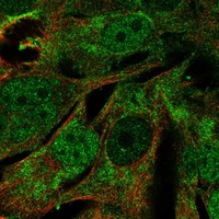 The "human cells" section gives an overview about the subcellular location of the protein of interest obtained by indirect immunofluorescence microscopy, an antibody-based protein-visualization technique. The immunofluorescent analysis is carried out in three different cell lines, one of them always being U-2 OS. A selection of immunofluorescent images is displayed below. Three different organelle probes are displayed as different channels in the multicolor images - nucleus stained in blue, microtubules in red and ER in yellow. The antibody staining targeting the protein of interest is shown in green. By using the toggle channel buttons, the different channels can be turned on and off. For the selection of the images to compare, use the checkboxes next to the images at the bottom. Three images can be compared at a time. All images are clickable for an enlarged view. The selected image will appear in large size and miniature images with all other staining results for this gene will be listed at the top left of the image. The selected miniature image has an orange overlay. For cell structure reference, visit the cell dictionary.