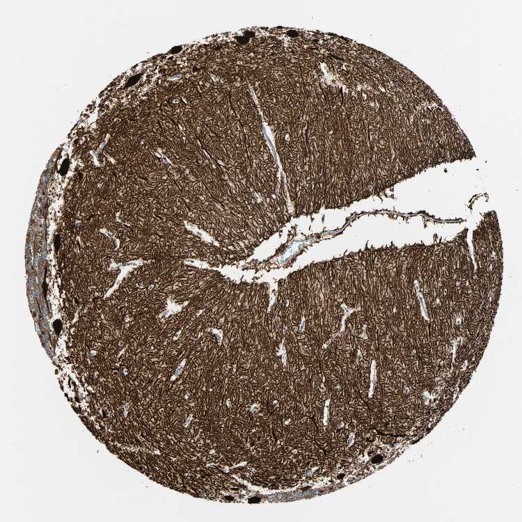 Antibody staining in the annotated cell types in the current human tissue is reported as not detected, low, medium, or high. This score is based on the staining intensity and fraction of stained cells.