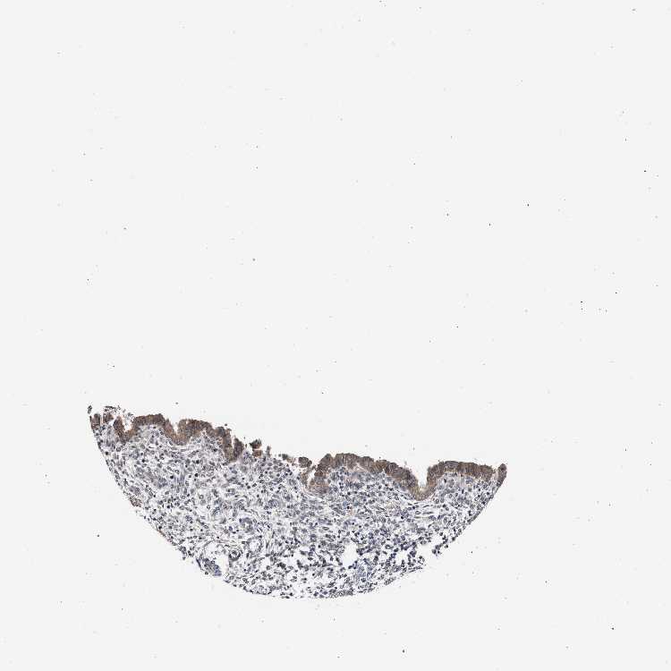 Antibody staining in the annotated cell types in the current human tissue is reported as not detected, low, medium, or high. This score is based on the staining intensity and fraction of stained cells.