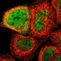 The "human cells" section gives an overview about the subcellular location of the protein of interest obtained by indirect immunofluorescence microscopy, an antibody-based protein-visualization technique. The immunofluorescent analysis is carried out in three different cell lines, one of them always being U-2 OS. A selection of immunofluorescent images is displayed below. Three different organelle probes are displayed as different channels in the multicolor images - nucleus stained in blue, microtubules in red and ER in yellow. The antibody staining targeting the protein of interest is shown in green. By using the toggle channel buttons, the different channels can be turned on and off. For the selection of the images to compare, use the checkboxes next to the images at the bottom. Three images can be compared at a time. All images are clickable for an enlarged view. The selected image will appear in large size and miniature images with all other staining results for this gene will be listed at the top left of the image. The selected miniature image has an orange overlay. For cell structure reference, visit the cell dictionary.