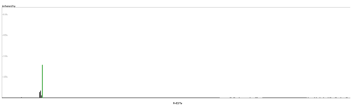 At the top of the view, the position of the antigen (identified by the corresponding HPA identifier) is shown as a green bar. A yellow triangle on the bar indicates a <100% sequence identity to the protein target.